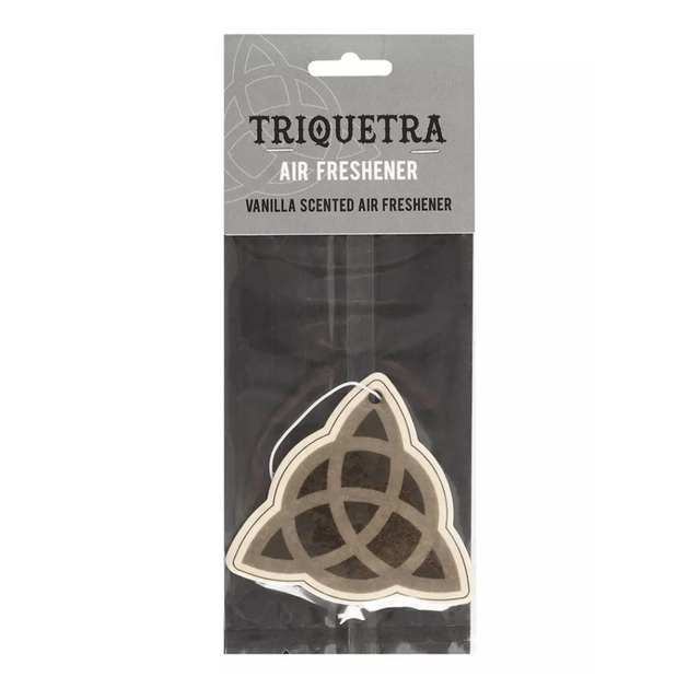 Enhance your space with the Triquetra Vanilla Scented Air Freshener. Perfect for hanging in your car or any room, this air freshener features the mystical Triquetra symbol and fills the air with a calming vanilla fragrance. Ideal for creating a fresh and inviting atmosphere while adding a touch of spiritual décor.